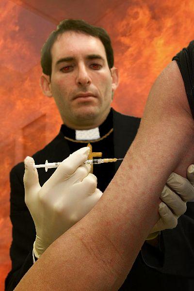 A final note of caution from the Church: “Some of the Fallen have been arguing that if the protected (vaccinated) child has truly gained immunity, his contact with an unvaccinated child should present no problem. Do not listen to this Beelzebub-logic. It is spurious, specious, and designed to deceive. It is the Germ speaking. The Germ weaves his foul polemic, he whispers his sly sophisms into the ears of the innocent. He even attempts to assume the position of God. When he intones and suggests, like the serpent, scream! Blot out his words! Say get thee behind me! Alert the authorities!”